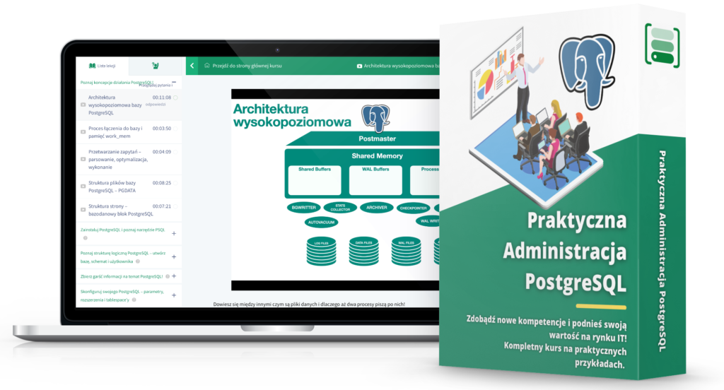 Ponad 50 wykładów video praktycznej wiedzy o administrowaniu, konfigurowaniu i optymalizowaniu bazy danych PostgreSQL, które pomogą Ci zwiększyć Twoje zarobki w IT!