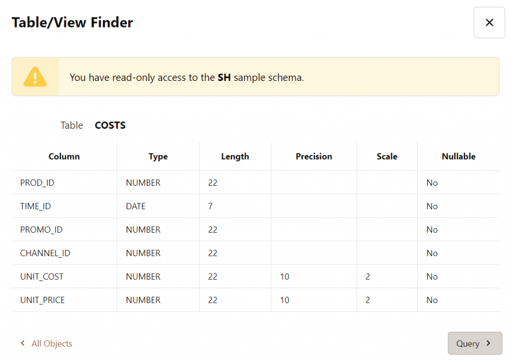 Tym razem baza zwróciła nam wszystkie kolumny dla tabeli. Możesz to zweryfikować klikając przycisk „Find” w Oracle Live SQL, zaznaczając schemat „Sales History(SH)” i wybierając tabele „COSTS”. W wyświetlonym widoku znajdziesz szczegółowe informacje na temat kolumn tabeli.