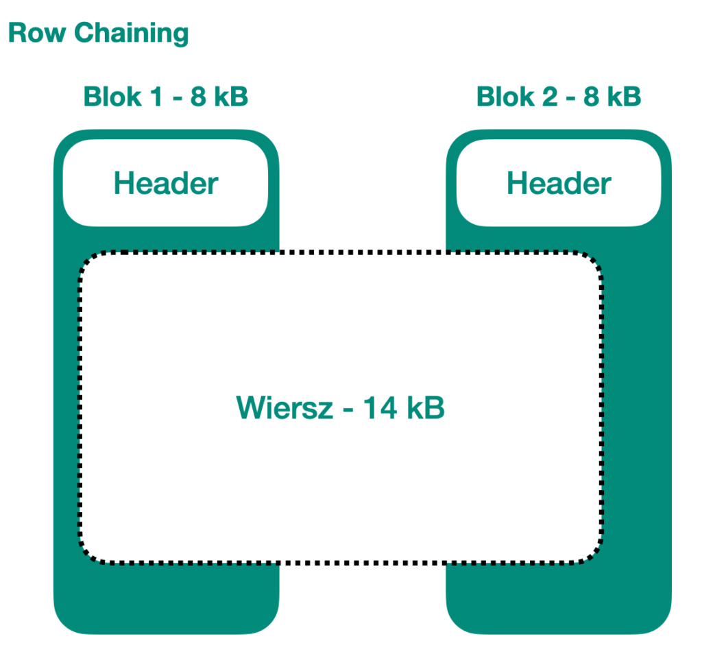 Łańcuchowanie wierszy występuje, gdy wiersz jest zbyt szeroki, aby zmieścił się w jednym bloku. W takim przypadku Oracle nie ma innego wyboru, jak podzielić wiersz na częśći. W rzeczywistości każdy wiersz składa się z nagłówka i części wiersza, ale istnieje tylko jeden nagłówek. Część wiersza z danymi jest przenoszona podczas migracji wierszy. Jeśli wiersz jest większy niż blok, to nagłówek wiersza i pierwsza część są umieszczane w pierwszym dostępnym bloku. Jeśli tworzony jest duży wiersz, następne części są zazwyczaj umieszczane w kolejnych blokach.