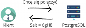 Proces uwierzytelniania w Postgres w przypadku scram-sha-256 jest bardziej skomplikowany. Użytkownik po przesłaniu do serwera prośby o nawiązanie połączenia otrzymuje informacje, że do uwierzytelniania musi wybrać jej metodę. Dla PostgreSQL jedyną dostępną opcją jest scram-sha-256.